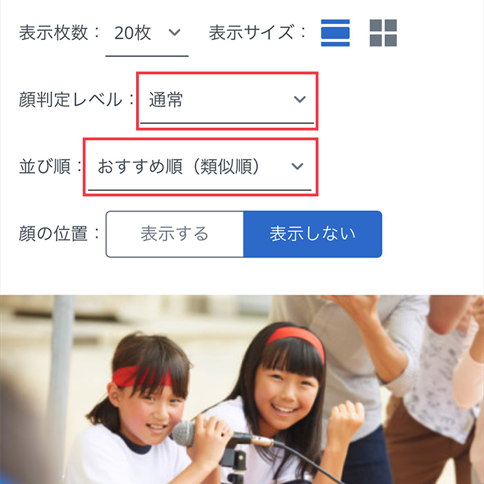 選択したかおだけに絞りたい場合は「高(写真少なめ)」にしてお試しください。並び順おすすめ順:選択したかおに似ている順