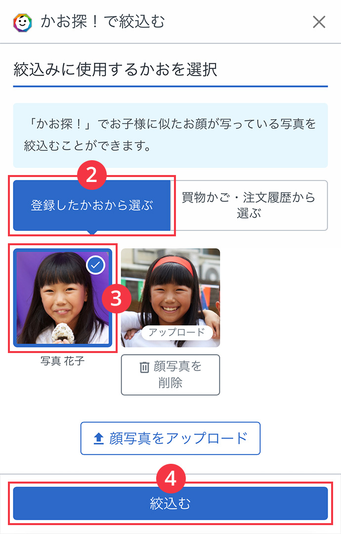 - 買物かごの写真・過去に購入した写真に写っているかおが一覧に表示されますので、絞込みに使用したいかおを最大5つまで選択します。